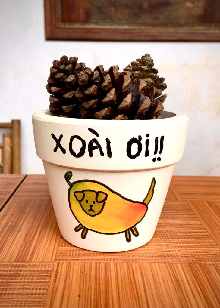 The owner of Vuon Yeu Garden gave me a pot and asked me to draw something cuteness. The idea of drawing a dog named Xoai wearing mango pattern outfit inside the Mango, oh that’s so complicated!!!
