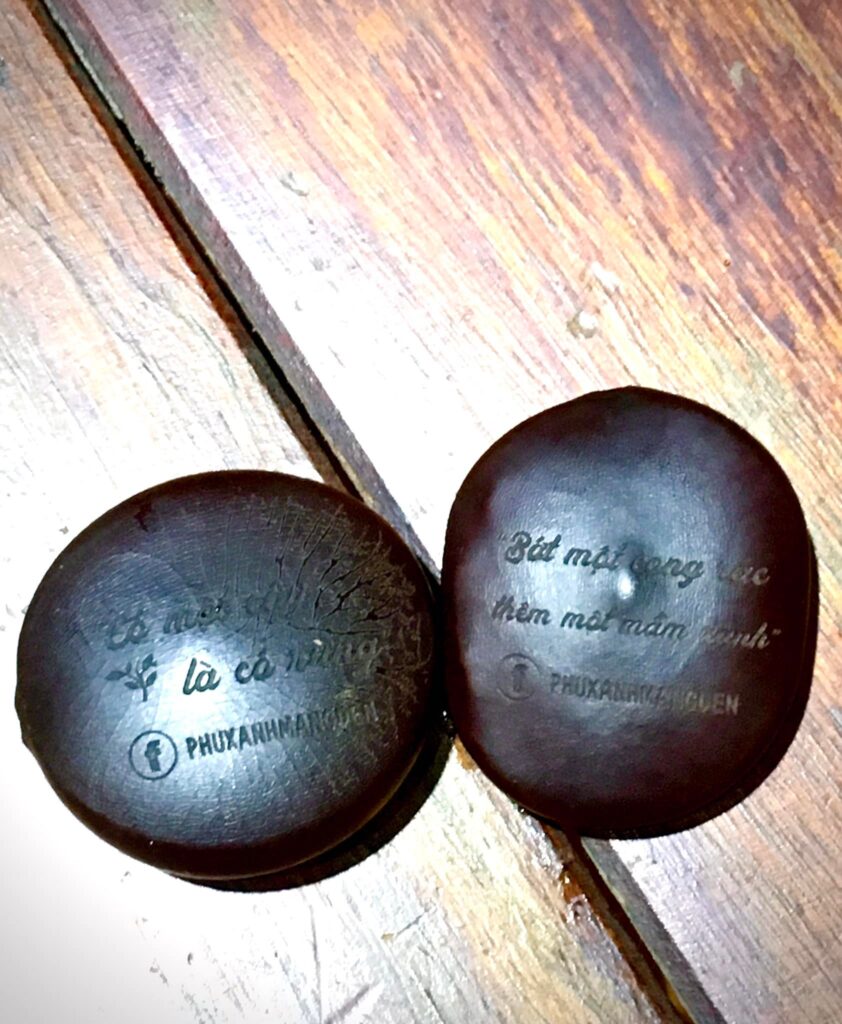 These are giant forest bean seeds which i collected when jogging with Mom these days. At the first time, i don’t have any idea what are they, until when we came to Xanh cafe and listened for the explanation of this tree! At Xanh cafe, the owners and their friends collect these bean seeds, wash them, and carve a beautiful tree, lovely slogan, then they sell them to get fund for growing Trees in this area! That’s amazing! I don’t know how to carve but i will try to plant these seeds, hopefully there are some giant bean trees in the future! 😉